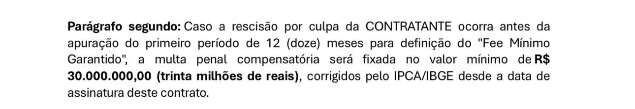 A antiga gestão já teria recebido R$ 4,5 milhões em antecipações, restando ainda R$ 14,5 milhões a serem pagos. No entanto, um eventual distrato com a BaladAPP pode gerar impactos financeiros relevantes. De acordo com documentos aos quais a reportagem teve acesso, a multa rescisória prevista no contrato pode chegar a R$ 30 milhões.