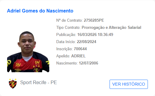 O Sport ampliou o contrato do volante Adriel, de 19 anos, até dezembro de 2027. Mesmo sem ter entrado em campo em 2026, o jovem segue integrado ao elenco profissional do Leão e é tratado como uma peça de potencial dentro do clube. Na última temporada, em 2025, Adriel somou 12 partidas pela equipe principal.